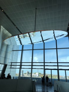 Det er som om hele den arkitektoniske idé kulminerer her oppe under taget med blandingen af aluminium, glas og beton, et imponerende lysindfald og udsigt mod en blå himmel, der spejler sig i fjorden.