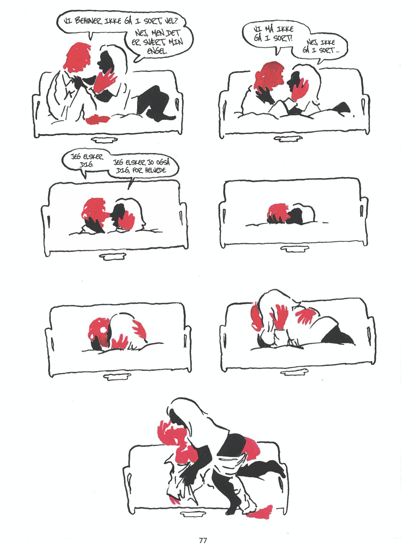 Sexakten med Kirsten er et centralt motiv for “Katarsis”. Luz bruger flere sider på at dvæle ved samlejet med kæresten, men det er hele tiden klart, at bevidstheden om det forfærdelig skyderi for Luz er smeltet sammen. Et knald holdt ham hjemme. Flere knald tog livet af kollegaerne på Charlie Hebdo.