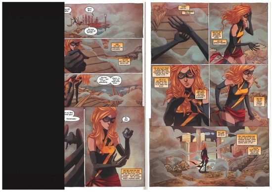 Fanget i en kokon, som hun bryder ud af. Forandret. Transformeret til Miss Marvel.