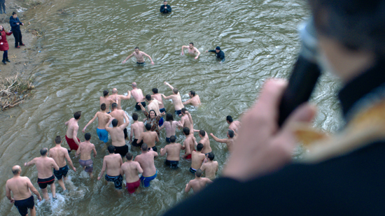 Hun får ikke jobbet. Vred og skuffet traver hun ned til floden, hvor den lokale, ortodokse præst ifølge med et større religiøst optog gør klar til at smide et lille trækors i den kolde flod.
