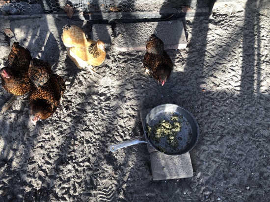 Så hjælper hønsene til. Når jeg går ud af bagdøren, kommer de straks løbende mig i møde. For helt ærligt. Forbarm dig dog! Du må da have en godbid, en rest fra aftensmaden eller en smule korn at smide til os altid sultne høns.