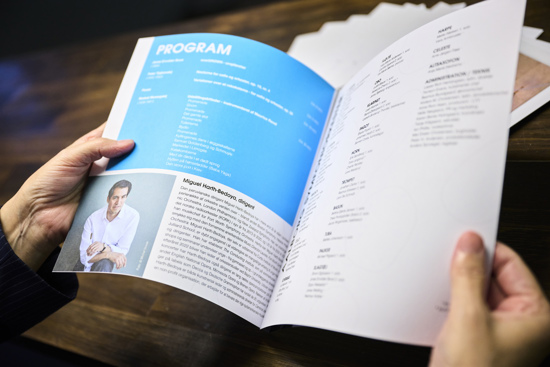 Nuvel, man får, som ved Aalborg Symfoniorkesters koncerter, udleveret en flersidet og -farvet brochure ved indgangen, og så kan man bruge de ti minutter før koncerten på, i halvmørke, at læse sig igennem de lange tekster, ofte trykt på mørkt papir i elegancens navn.