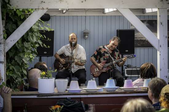 Det fungerede fint, når de på skift tog vokalen. Voldsomt hyggeligt at sidde i det varme solskin, mens vejen foran ”Kulturen” midlertidigt var spærret af tætpakkede stole.