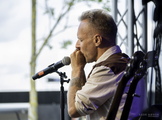 Tidlig eftermiddag på samme plads åbnede H.P. Lange, Mississippi-steel guitar, banjo og vokal, sammen med mundharpespiller Jarno Varsted.