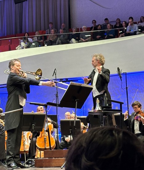 Koncertens overskrift var "Britten og Tjaijkovskij", men hovedpersonen var Holten. Bo Holten, født 1948. Den danske komponist har skrevet en koncert for basun og orkester og den slags er også en sjældenhed.