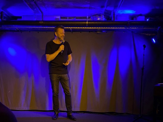 Den nøgne optræden med kun guitar og mikrofon gav en dejlig opvarmning, men festen blev først for alvor skudt i gang, da aftenens hovedgæst kom frem på scenen kl. 21.15.
