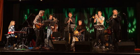 Inden blæsergruppen, Mygind, Banke, Halle og Agerholm, efter Dørges filigranintro på guitar satte i med præcise og velklingende kor. Præcist swingende. Efterfulgt af atonal hønsepludren, inden den saftige Banke-solo, og senere trombonespiller Agerholm med hænderne illustrativt over hovedet lærte os at klappe i rytmisk takt.