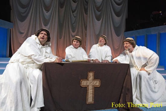 Så er der anderledes fart over feltet i anden akt med hele ensemblet på scenen i sketchen ”Pest over Børglum” med vidunderlige citater fra den danske sangskat, mens munkene pønser på at brænde hele Bindslev af. Fed coronasatire!